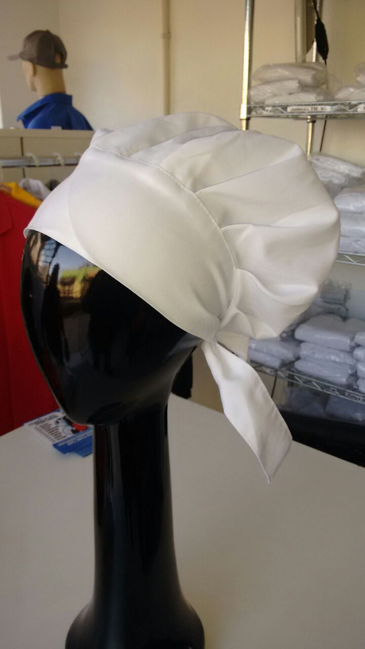 TOUCA EM TECIDO OXFORD COM COSTURA FRANZIDA E AMARRAR ATRAZ.
